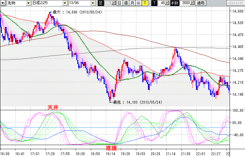 2013/05/25 - tensokoさんの株式ブログ。タイトル:「★5/25 夜間の株価の天底★」 本文:★5/25 夜間の株価の天底★ ↓クリックで画像拡大↓ ※指標ラインの密集点が天底・転換点を示します。指標の見方日経225large先物チャート : 48ティック足天井 : 14590 (5/24