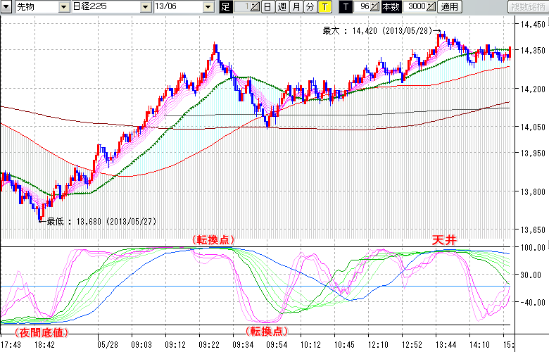 2013/05/28 - tensokoさんの株式ブログ。タイトル:「★5/28 日中の株価の天井★」 本文:★5/28 日中の株価の天井★ ↓クリックで画像拡大↓ ※指標ラインの密集点が天底・転換点を示します。指標の見方日経225large先物チャート : 96ティック足天井 : 14420 (5/28