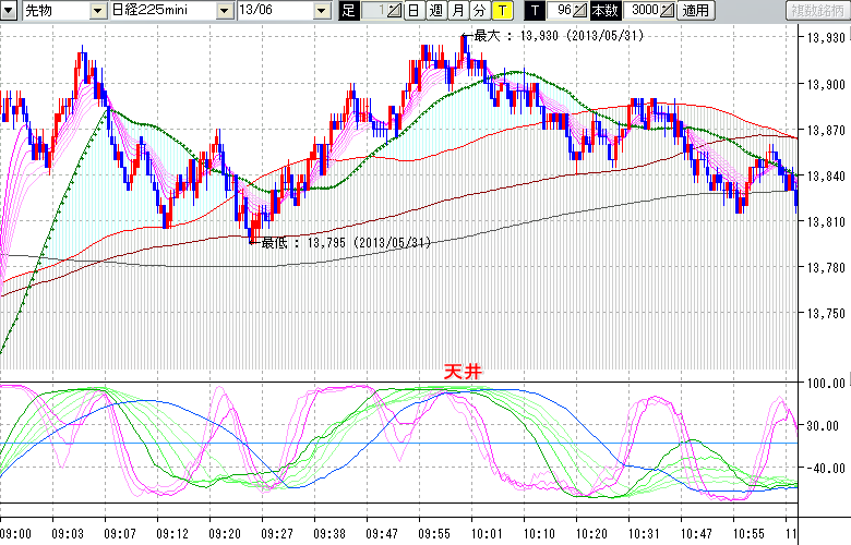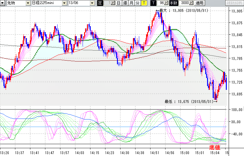 2013/05/31 - tensokoさんの株式ブログ。タイトル:「★5/31 日中の株価の天底★」 本文:★5/31 日中の株価の天底★ ↓クリックで画像拡大↓ ↓クリックで画像拡大↓ ※指標ラインの密集点が天底・転換点を示します。指標の見方日経225mini先物チャート(上) :