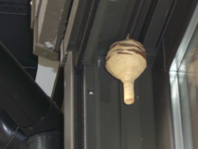 2013/05/31 - 中州天神さんの株式ブログ。タイトル:「人知れず、こっそりと不法占拠」 本文:ふと、軒下を見上げれば、トックリがぶら下がっている。蜂の巣だろうが、こんな形は初めてで、いつの間に・・・・・。証拠写真を撮っていたら、犯人の蜂が戻って来た。大所帯になる前に、早目に処理しなければ大変な