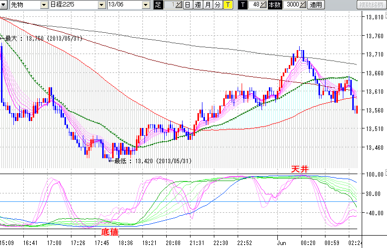 2013/06/01 - tensokoさんの株式ブログ。タイトル:「★5/31 夜間の株価の天底★」 本文:★5/31 夜間の株価の天底★ ↓クリックで画像拡大↓ ※指標ラインの密集点が天底・転換点を示します。指標の見方日経225large先物チャート : 48ティック足底値 : 13420 (5/31