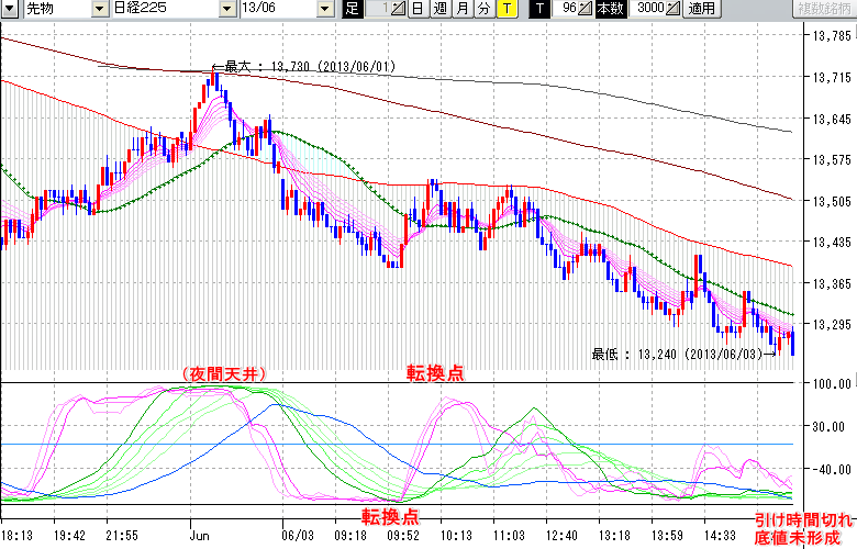 2013/06/03 - tensokoさんの株式ブログ。タイトル:「★6/3 日中の株価の転換点★」 本文:★6/3 日中の株価の転換点★ ↓クリックで画像拡大↓ ※指標ラインの密集点が天底・転換点を示します。指標の見方日経225large先物チャート : 96ティック足転換点1 : 13390 (6/3