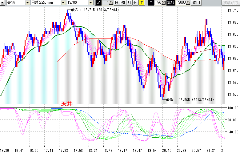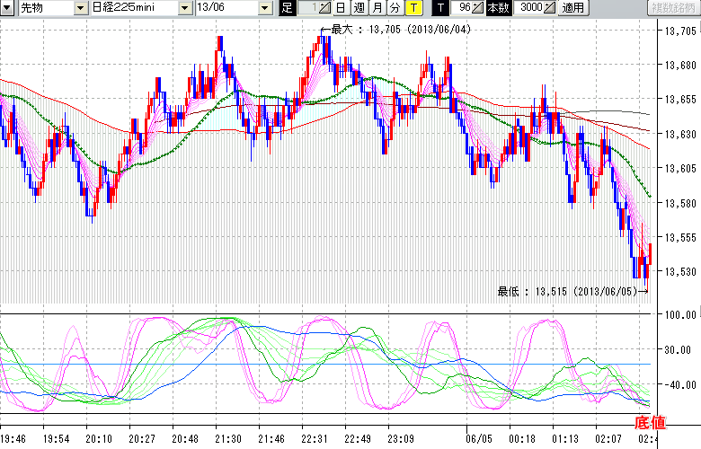 2013/06/05 - tensokoさんの株式ブログ。タイトル:「★6/4 夜間の株価の天底★」 本文:★6/4 夜間の株価の天底★ ↓クリックで画像拡大↓ ↓クリックで画像拡大↓ ※指標ラインの密集点が天底・転換点を示します。指標の見方日経225mini先物チャート(上) :