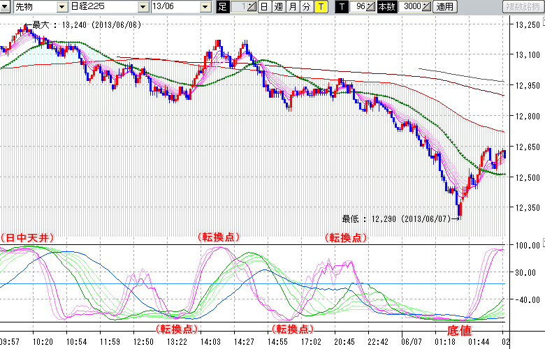 2013/06/07 - tensokoさんの株式ブログ。タイトル:「★6/6 夜間の株価の底値★」 本文:★6/6 夜間の株価の底値★ ↓クリックで画像拡大↓ ※指標ラインの密集点が天底・転換点を示します。指標の見方日経225large先物チャート : 96ティック足底値 : 12290 (6/7
