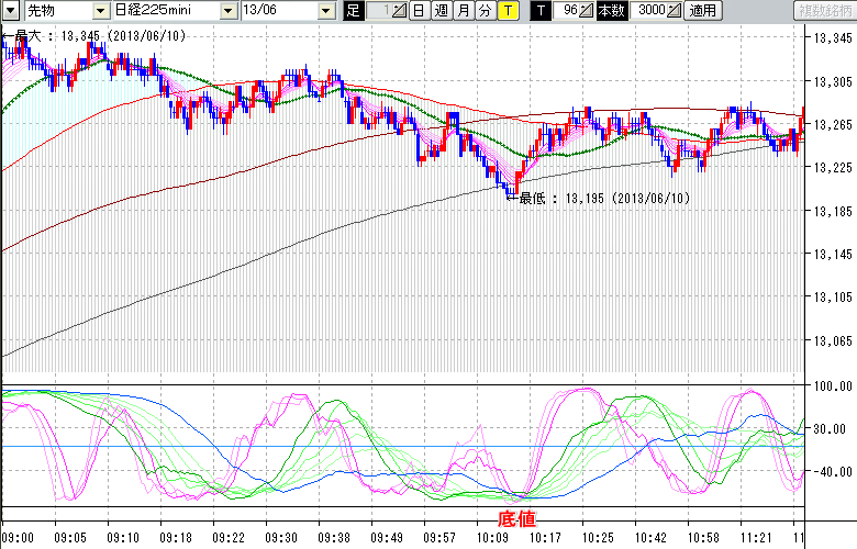 2013/06/10 - tensokoさんの株式ブログ。タイトル:「★6/10 日中の株価の天底★」 本文:★6/10 日中の株価の天底★ ↓クリックで画像拡大↓ ↓クリックで画像拡大↓ ※指標ラインの密集点が天底・転換点を示します。指標の見方日経225mini先物チャート(上) :