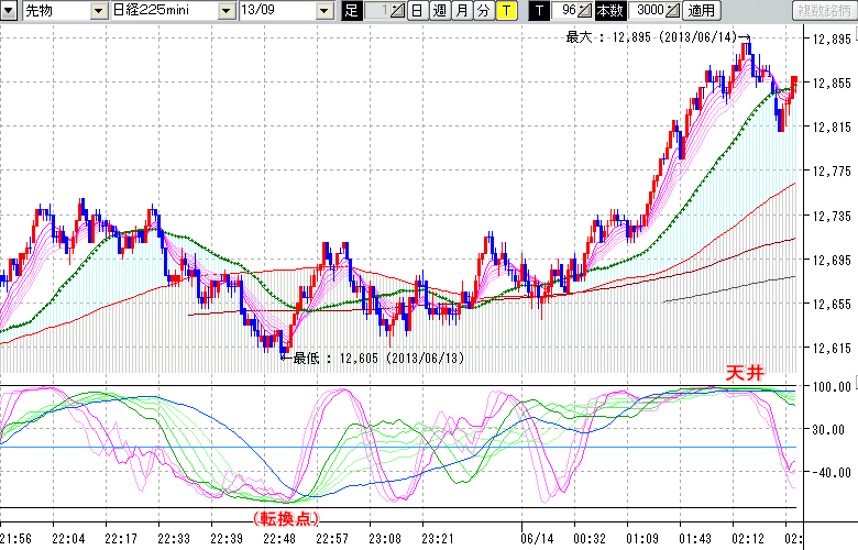 2013/06/14 - tensokoさんの株式ブログ。タイトル:「★6/13 夜間の株価の天井★」 本文:★6/13 夜間の株価の天井★ ↓クリックで画像拡大↓ ※指標ラインの密集点が天底・転換点を示します。指標の見方日経225mini先物チャート : 96ティック足天井 : 12895 (6/14