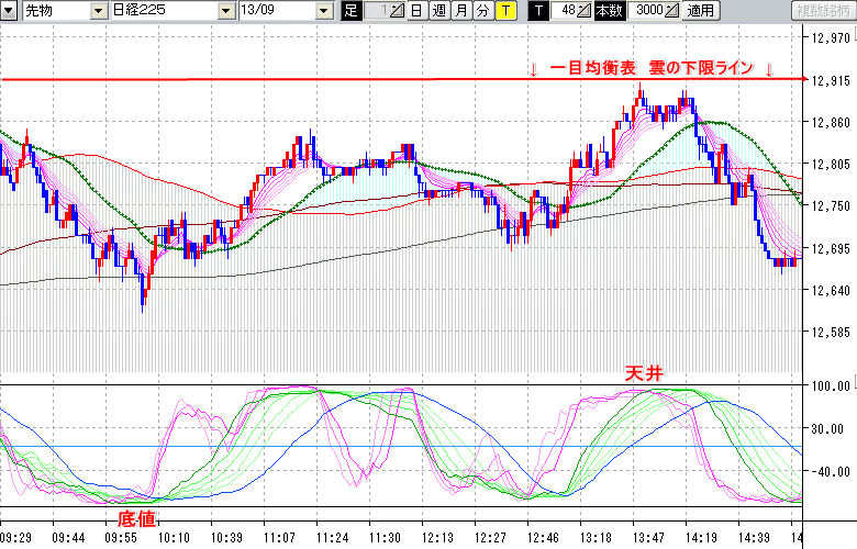 2013/06/14 - tensokoさんの株式ブログ。タイトル:「★雲の下限ラインをタッチできず、底入れは先送りか?!★」 本文:(6/14 日中の株価の天底★) ↓クリックで画像拡大↓ ※指標ラインの密集点が天底・転換点を示します。指標の見方日経225large先物チャート : 48ティック足底値 : 12610 (6/14