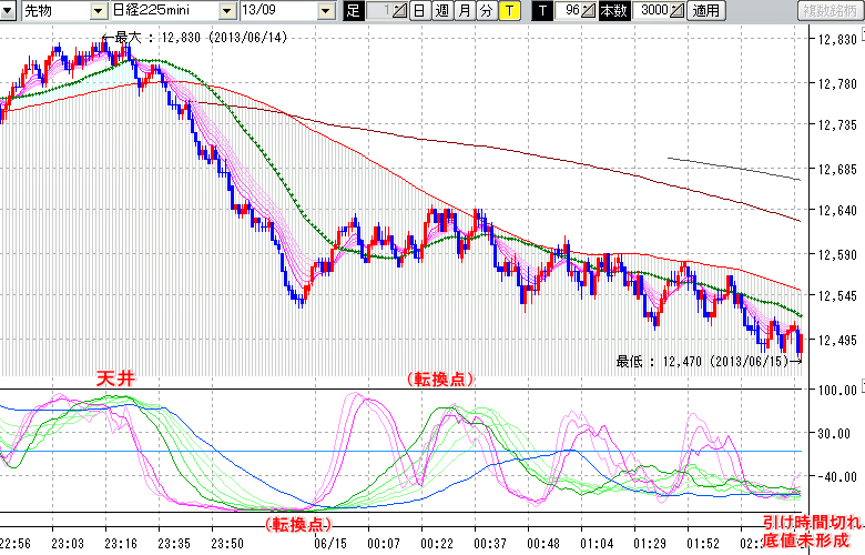 2013/06/15 - tensokoさんの株式ブログ。タイトル:「★6/14 夜間の株価の天底★」 本文:★6/14 夜間の株価の天底★ ↓クリックで画像拡大↓ ※指標ラインの密集点が天底・転換点を示します。指標の見方日経225mini先物チャート : 96ティック足天井 : 12830 (6/14
