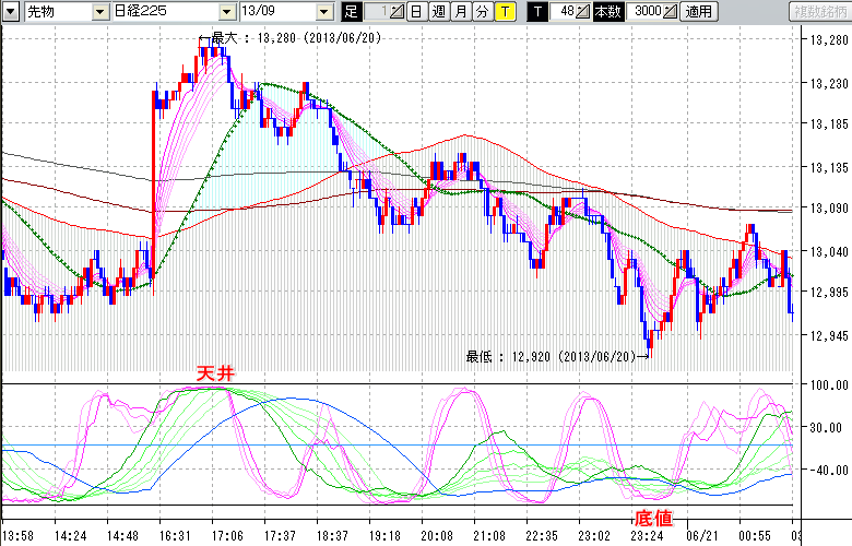 2013/06/21 - tensokoさんの株式ブログ。タイトル:「★6/20 夜間の株価の天底★」 本文:★6/20 夜間の株価の天底★ ↓クリックで画像拡大↓ ※指標ラインの密集点が天底・転換点を示します。指標の見方日経225large先物チャート : 48ティック足天井 : 13280 (6/20