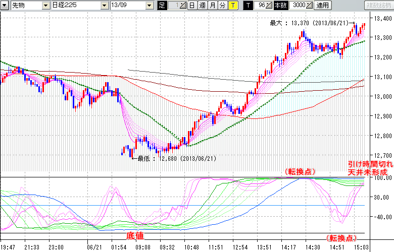 2013/06/21 - tensokoさんの株式ブログ。タイトル:「★6/21 日中の株価の天底★」 本文:★6/21 日中の株価の天底★ ↓クリックで画像拡大↓ ※指標ラインの密集点が天底・転換点を示します。指標の見方日経225large先物チャート : 96ティック足底値 : 12680 (6/21