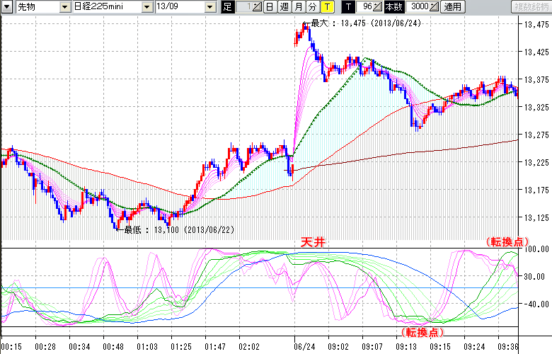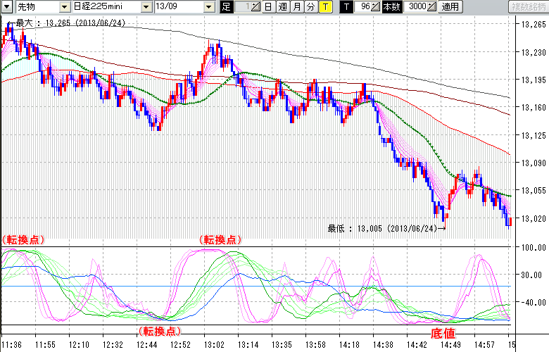 2013/06/24 - tensokoさんの株式ブログ。タイトル:「★6/24 日中の株価の天底★」 本文:★6/24 日中の株価の天底★ ↓クリックで画像拡大↓ ↓クリックで画像拡大↓ ※指標ラインの密集点が天底・転換点を示します。指標の見方日経225mini先物チャート(上) :