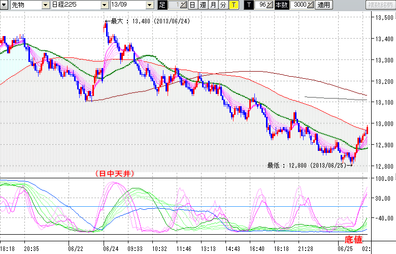 2013/06/25 - tensokoさんの株式ブログ。タイトル:「★6/24 夜間の株価の底値★」 本文:★6/24 夜間の株価の底値★ ↓クリックで画像拡大↓ ※指標ラインの密集点が天底・転換点を示します。指標の見方日経225large先物チャート : 96ティック足底値 : 12800 (6/25
