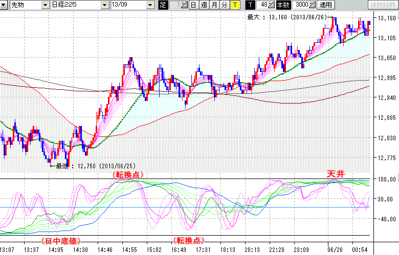 2013/06/26 - tensokoさんの株式ブログ。タイトル:「★6/25 夜間の株価の天底★」 本文:★6/25 夜間の株価の天底★ ↓クリックで画像拡大↓ ※指標ラインの密集点が天底・転換点を示します。指標の見方日経225large先物チャート : 48ティック足天井 : 13160 (6/26