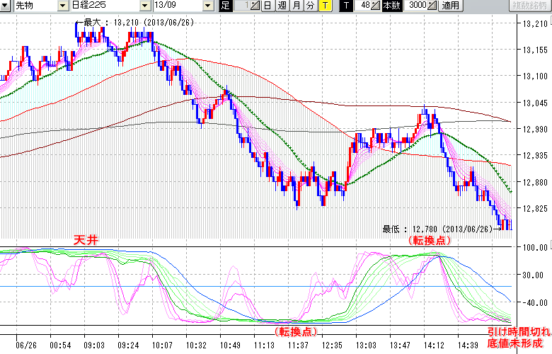 2013/06/26 - tensokoさんの株式ブログ。タイトル:「★6/26 日中の株価の天底★」 本文:★6/26 日中の株価の天底★ ↓クリックで画像拡大↓ ※指標ラインの密集点が天底・転換点を示します。指標の見方日経225large先物チャート : 48ティック足天井 : 13210 (6/26