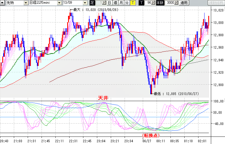 2013/06/27 - tensokoさんの株式ブログ。タイトル:「★6/26 夜間の株価の天井★」 本文:★6/26 夜間の株価の天井★ ↓クリックで画像拡大↓ ※指標ラインの密集点が天底・転換点を示します。指標の見方日経225mini先物チャート : 96ティック足天井 : 13020 (6/26