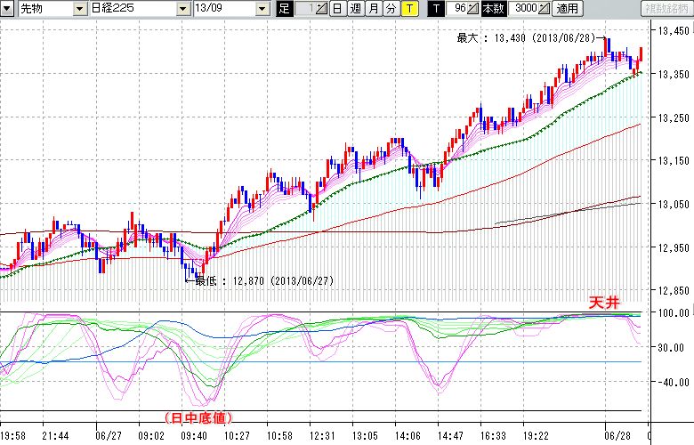 2013/06/28 - tensokoさんの株式ブログ。タイトル:「★6/27 夜間の株価の天井★」 本文:★6/27 夜間の株価の天井★ ↓クリックで画像拡大↓ ※指標ラインの密集点が天底・転換点を示します。指標の見方日経225large先物チャート : 96ティック足天井 : 13430 (6/28
