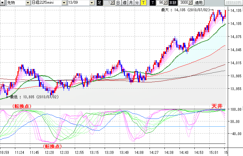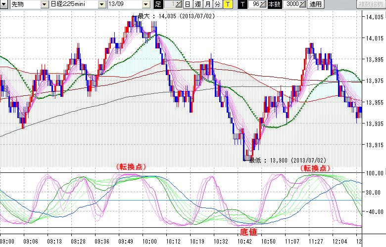 2013/07/02 - tensokoさんの株式ブログ。タイトル:「★7/2 日中の株価の天底★」 本文:★7/2 日中の株価の天底★ ↓クリックで画像拡大↓ ↓クリックで画像拡大↓ ※指標ラインの密集点が天底・転換点を示します。指標の見方日経225mini先物チャート(上) :