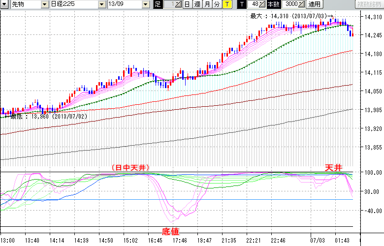 2013/07/03 - tensokoさんの株式ブログ。タイトル:「★7/2 夜間の株価の天底★」 本文:★7/2 夜間の株価の天底★ ↓クリックで画像拡大↓ ※指標ラインの密集点が天底・転換点を示します。指標の見方日経225large先物チャート : 48ティック足底値 : 14050 (7/21