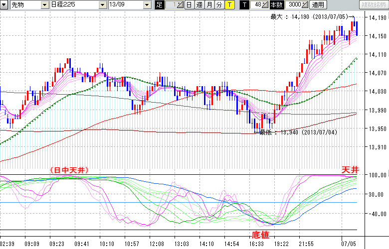 2013/07/05 - tensokoさんの株式ブログ。タイトル:「★7/4 夜間の株価の天底★」 本文:★7/4 夜間の株価の天底★ ↓クリックで画像拡大↓ ※指標ラインの密集点が天底・転換点を示します。指標の見方日経225large先物チャート : 48ティック足底値 : 13940 (7/4