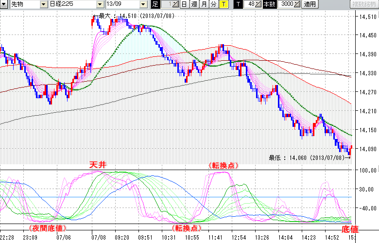 2013/07/08 - tensokoさんの株式ブログ。タイトル:「★7/8 日中の株価の天底★」 本文:★7/8 日中の株価の天底★ ↓クリックで画像拡大↓ ※指標ラインの密集点が天底・転換点を示します。指標の見方日経225large先物チャート : 48ティック足天井 : 14510 (7/8