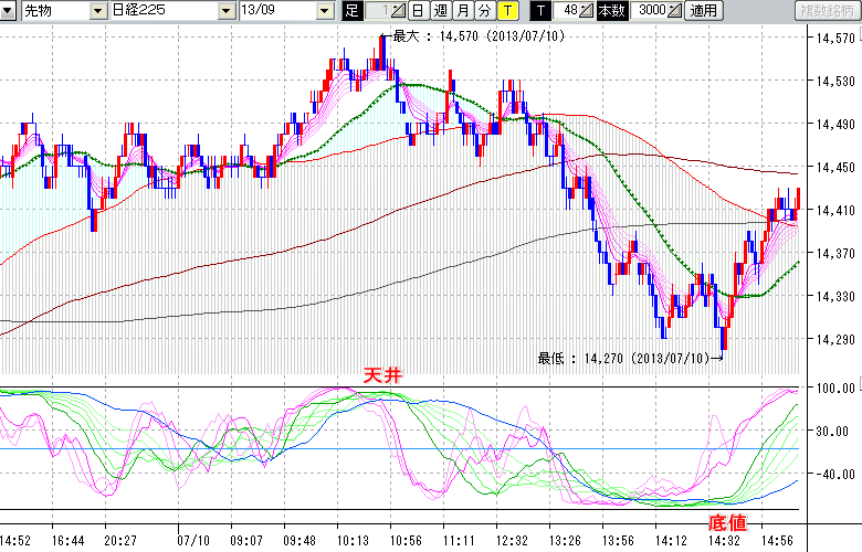 2013/07/10 - tensokoさんの株式ブログ。タイトル:「★7/10 日中の株価の天底★」 本文:★7/10 日中の株価の天底★ ↓クリックで画像拡大↓ ※指標ラインの密集点が天底・転換点を示します。指標の見方日経225large先物チャート : 48ティック足天井 : 14570 (7/10