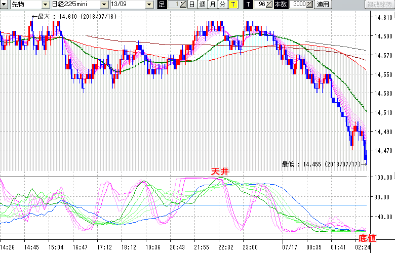 2013/07/17 - tensokoさんの株式ブログ。タイトル:「★7/16 夜間の株価の天底★」 本文:★7/16 夜間の株価の天底★ ↓クリックで画像拡大↓ ※指標ラインの密集点が天底・転換点を示します。指標の見方日経225mini先物チャート : 96ティック足天井 : 14605 (7/16