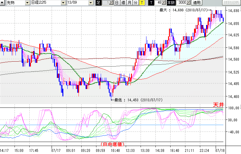 2013/07/18 - tensokoさんの株式ブログ。タイトル:「★7/17 夜間の株価の天井★」 本文:★7/17 夜間の株価の天井★ ↓クリックで画像拡大↓ ※指標ラインの密集点が天底・転換点を示します。指標の見方日経225large先物チャート : 48ティック足天井 : 14690 (7/18