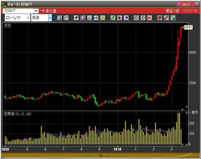 2013/07/18 - 暁投資顧問さんの株式ブログ。タイトル:「平成25年7月18日(木) 雑感」 本文:これは富士重工の月足チャート。いやはや、凄いとしか言いようがない。株価のパフォーマンスではトヨタを優に凌ぐ。しかも史上最高値で貸借倍率は19.5倍。いい加減に天井を付けそうな気もするがどこまで上昇する