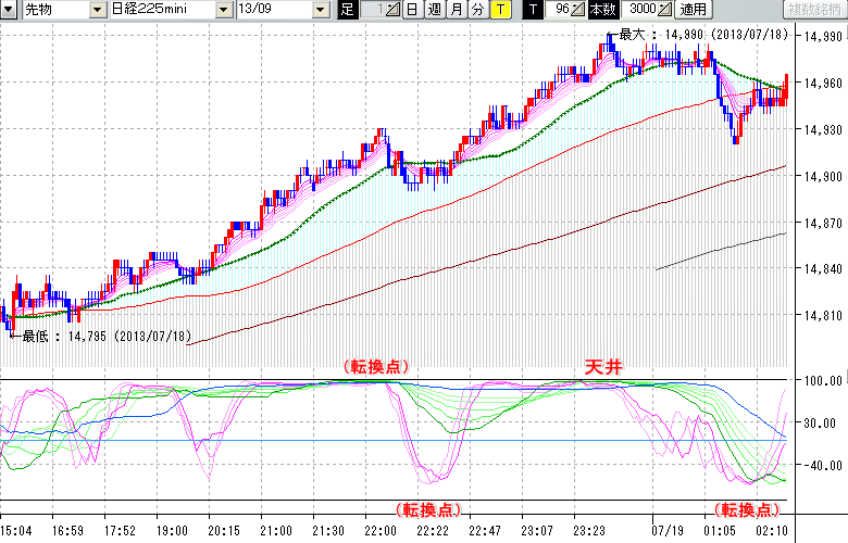 2013/07/19 - tensokoさんの株式ブログ。タイトル:「★7/18 夜間の株価の天井★」 本文:★7/18 夜間の株価の天井★ ↓クリックで画像拡大↓ ※指標ラインの密集点が天底・転換点を示します。指標の見方日経225mini先物チャート : 96ティック足天井 : 14990 (7/18