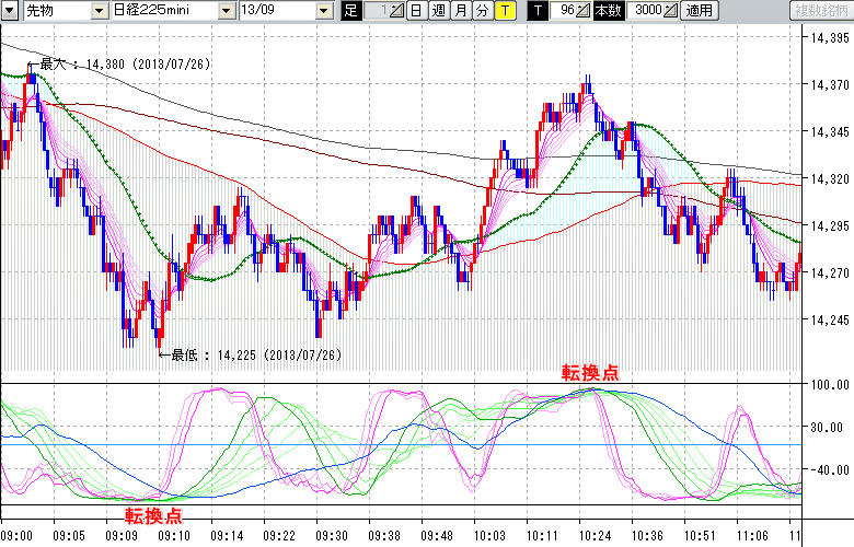2013/07/26 - tensokoさんの株式ブログ。タイトル:「★7/26 日中の株価の転換点★」 本文:★7/26 日中の株価の転換点★ ↓クリックで画像拡大↓ ↓クリックで画像拡大↓ ※指標ラインの密集点が天底・転換点を示します。指標の見方日経225mini先物チャート(上) :