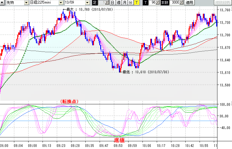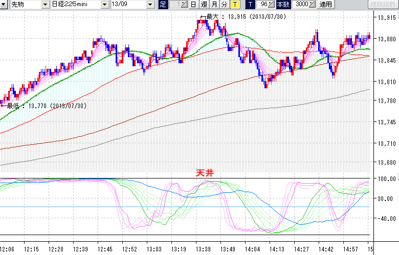 2013/07/30 - tensokoさんの株式ブログ。タイトル:「★7/30 日中の株価の天底★」 本文:★7/30 日中の株価の天底★ ↓クリックで画像拡大↓ ↓クリックで画像拡大↓ ※指標ラインの密集点が天底・転換点を示します。指標の見方日経225mini先物チャート(上) :