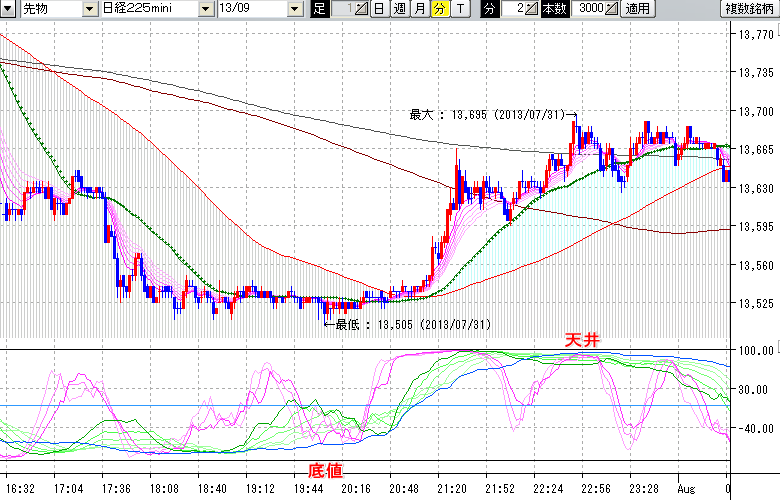 2013/08/01 - tensokoさんの株式ブログ。タイトル:「★7/31 夜間の株価の天底★」 本文:★7/31 夜間の株価の天底★ ↓クリックで画像拡大↓ ※指標ラインの密集点が天底・転換点を示します。指標の見方日経225mini先物チャート : 2分足底値 : 13505 (7/31