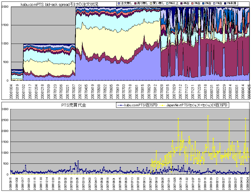 2008/04/26 - miyakenさんの株式ブログ。タイトル:「kabu.comPTS ~2008/04/25」 本文:kabu.comPTSの引けの注文状況と、売買代金のグラフです。 JapanNextPTSの売買代金は、推計値です。公式のものではありません。