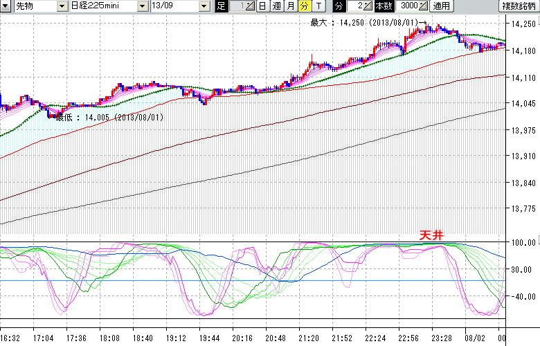 2013/08/02 - tensokoさんの株式ブログ。タイトル:「★8/1 夜間の株価の天井★」 本文:★8/1 夜間の株価の天井★ ↓クリックで画像拡大↓ ※指標ラインの密集点が天底・転換点を示します。指標の見方日経225mini先物チャート : 2分足天井 : 14250 (8/1