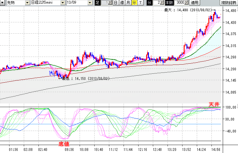 2013/08/02 - tensokoさんの株式ブログ。タイトル:「★8/2 日中の株価の天底★」 本文:★8/2 日中の株価の天底★ ↓クリックで画像拡大↓ ※指標ラインの密集点が天底・転換点を示します。指標の見方日経225mini先物チャート : 2分足底値 : 14150 (8/2