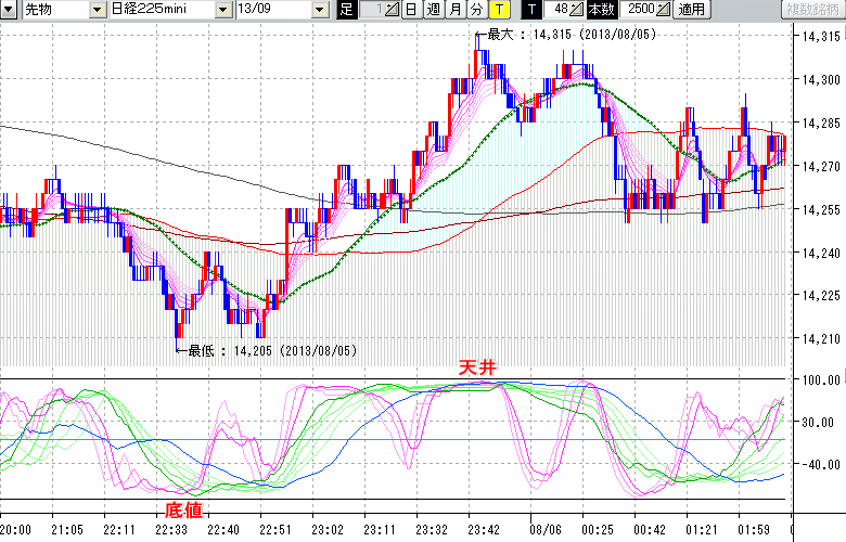 2013/08/06 - tensokoさんの株式ブログ。タイトル:「★8/5 夜間の株価の天底★」 本文:★8/5 夜間の株価の天底★ ↓クリックで画像拡大↓ ※指標ラインの密集点が天底・転換点を示します。指標の見方日経225mini先物チャート : 48ティック足底値 : 14205 (8/5