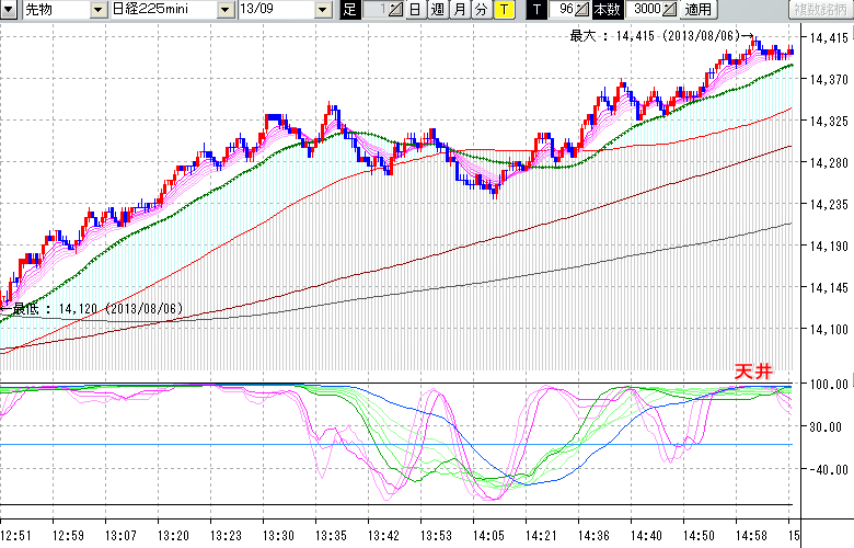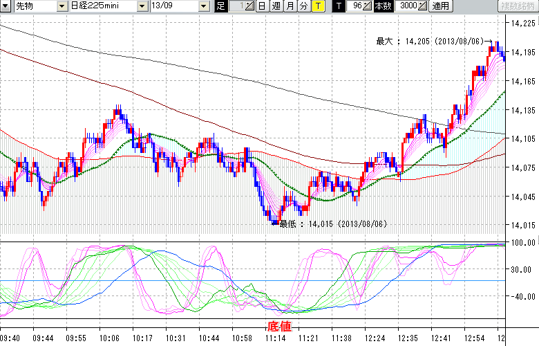 2013/08/06 - tensokoさんの株式ブログ。タイトル:「★8/6 日中の株価の天底★」 本文:★8/6 日中の株価の天底★ ↓クリックで画像拡大↓ ↓クリックで画像拡大↓ ※指標ラインの密集点が天底・転換点を示します。指標の見方日経225mini先物チャート(上) :