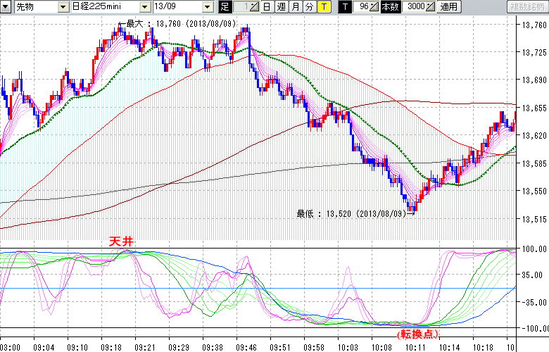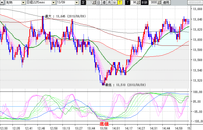 2013/08/09 - tensokoさんの株式ブログ。タイトル:「★8/9 日中の株価の天底★」 本文:★8/9 日中の株価の天底★ ↓クリックで画像拡大↓ ↓クリックで画像拡大↓ ※指標ラインの密集点が天底・転換点を示します。指標の見方日経225mini先物チャート(上) :