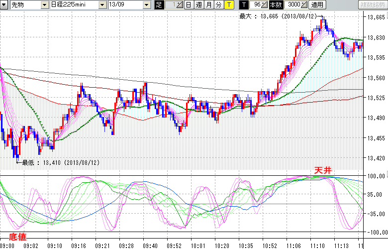 2013/08/12 - tensokoさんの株式ブログ。タイトル:「★8/12 日中の株価の天底」 本文:★8/12 日中の株価の天底★ ↓クリックで画像拡大↓ ※指標ラインの密集点が天底・転換点を示します。指標の見方日経225mini先物チャート : 96ティック足底値 : 13410 (8/12