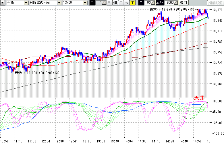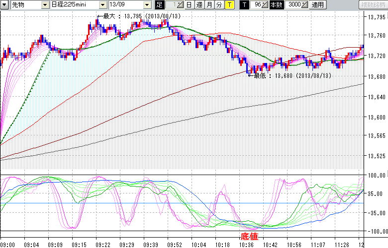 2013/08/13 - tensokoさんの株式ブログ。タイトル:「★8/13 日中の株価の天底★」 本文:★8/13 日中の株価の天底★ ↓クリックで画像拡大↓ ↓クリックで画像拡大↓ ※指標ラインの密集点が天底・転換点を示します。指標の見方日経225mini先物チャート(上) :