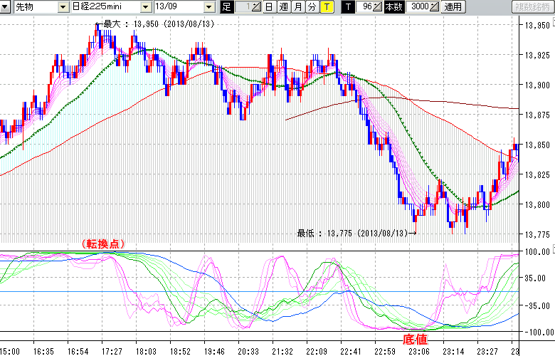 2013/08/14 - tensokoさんの株式ブログ。タイトル:「★8/13 夜間の株価の底値★」 本文:★8/13 夜間の株価の底値★ ↓クリックで画像拡大↓ ※指標ラインの密集点が天底・転換点を示します。指標の見方日経225mini先物チャート : 96ティック足底値 : 13775 (8/13