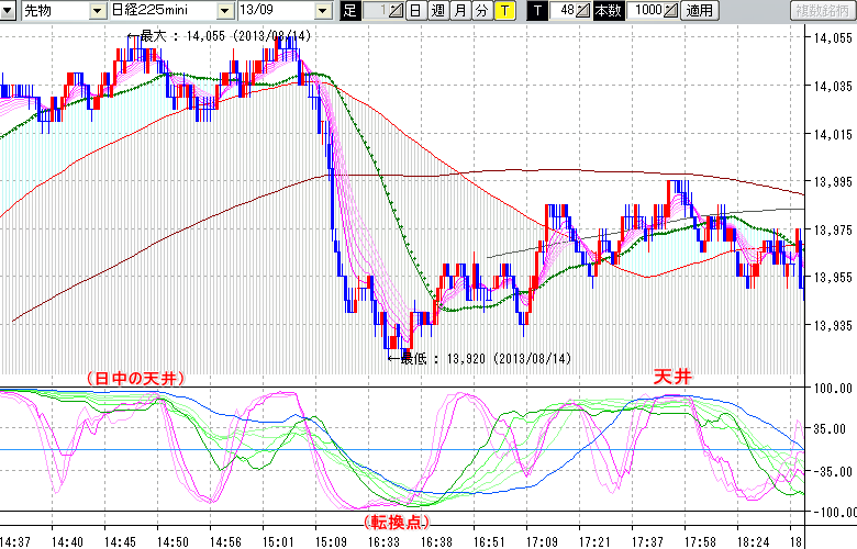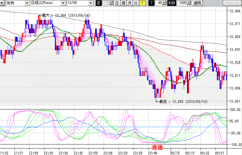 2013/08/15 - tensokoさんの株式ブログ。タイトル:「★8/14 夜間の株価の天底★」 本文:★8/14 夜間の株価の天底★ ↓クリックで画像拡大↓ ↓クリックで画像拡大↓ ※指標ラインの密集点が天底・転換点を示します。指標の見方日経225mini先物チャート(上) :