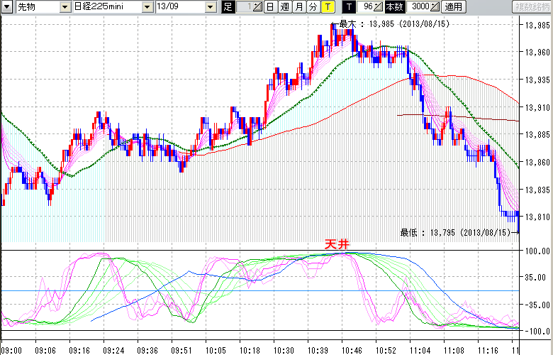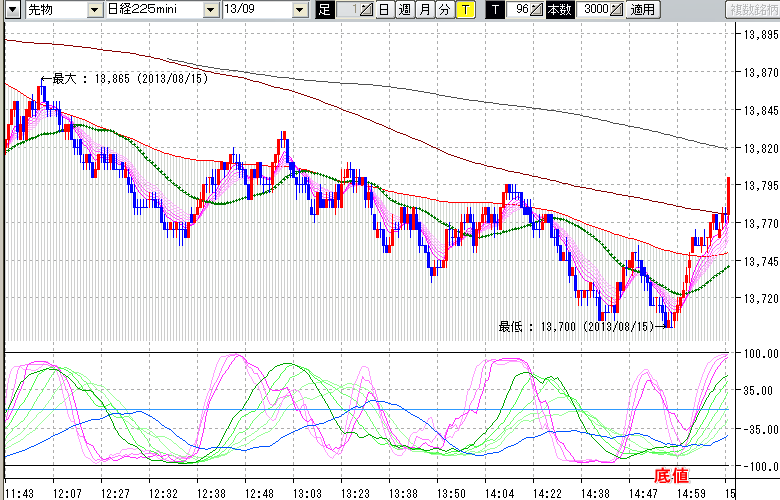 2013/08/15 - tensokoさんの株式ブログ。タイトル:「★8/15 日中の株価の天底★」 本文:★8/15 日中の株価の天底★ ↓クリックで画像拡大↓ ↓クリックで画像拡大↓ ※指標ラインの密集点が天底・転換点を示します。指標の見方日経225mini先物チャート(上) :