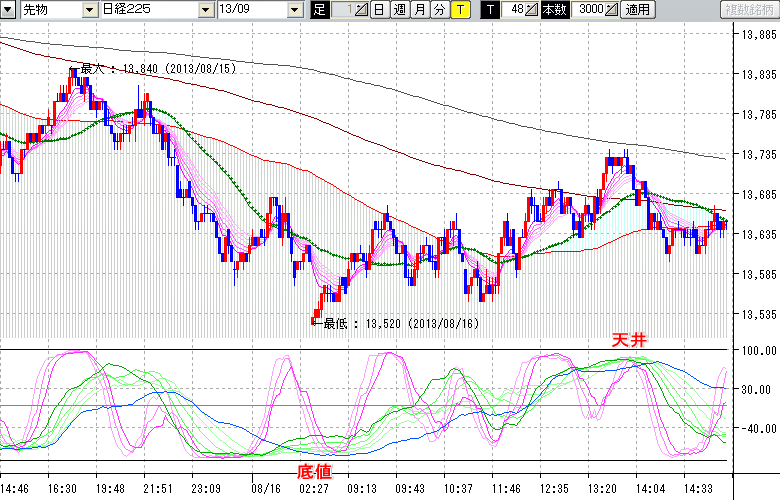2013/08/16 - tensokoさんの株式ブログ。タイトル:「★8/16 日中の株価の天底★」 本文:★8/16 日中の株価の天底★ ↓クリックで画像拡大↓ ※指標ラインの密集点が天底・転換点を示します。指標の見方日経225large先物チャート : 48ティック足底値 : 13520 (8/16