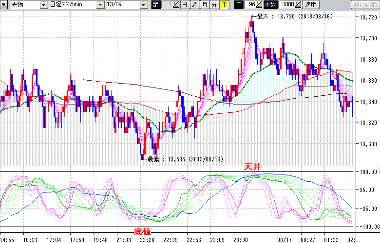 2013/08/17 - tensokoさんの株式ブログ。タイトル:「★8/16 夜間の株価の天底★」 本文:★8/16 夜間の株価の天底★ ↓クリックで画像拡大↓ ※指標ラインの密集点が天底・転換点を示します。指標の見方日経225mini先物チャート : 96ティック足底値 : 13585 (8/16