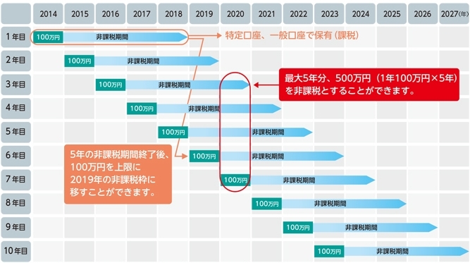 ちなみにその非課税期間というのは、投資してからの5年間ではなく、投資する期間から5年目の年末までとなっています。例えば2014年の1~12月に投資した分の非課税期間は2018年の年末までとなります…