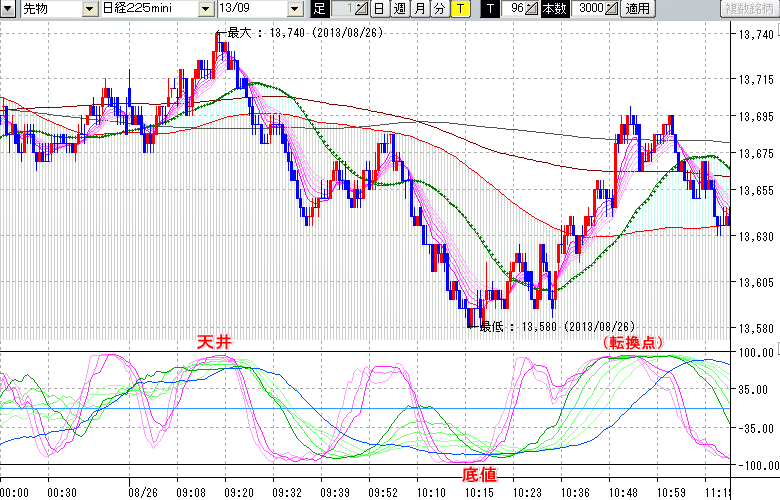 2013/08/26 - tensokoさんの株式ブログ。タイトル:「★8/26 日中の株価の天底★」 本文:★8/26 日中の株価の天底★ ↓クリックで画像拡大↓ ※指標ラインの密集点が天底・転換点を示します。指標の見方日経225mini先物チャート : 96ティック足天井 : 13740 (8/26