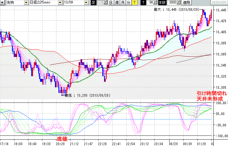 2013/08/29 - tensokoさんの株式ブログ。タイトル:「★8/28 夜間の株価の天底★」 本文:★8/28 夜間の株価の天底★ ↓クリックで画像拡大↓ ※指標ラインの密集点が天底・転換点を示します。指標の見方日経225mini先物チャート : 96ティック足底値 : 13290 (8/28