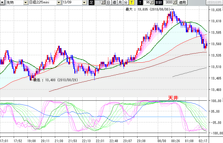 2013/08/30 - tensokoさんの株式ブログ。タイトル:「★8/29 夜間の株価の天井★」 本文:★8/29 夜間の株価の天井★ ↓クリックで画像拡大↓ ※指標ラインの密集点が天底・転換点を示します。指標の見方日経225mini先物チャート : 96ティック足天井 : 13635 (8/30