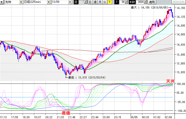 2013/09/05 - tensokoさんの株式ブログ。タイトル:「★9/4 夜間の株価の天底★」 本文:★9/4 夜間の株価の天底★ ↓クリックで画像拡大↓ ※指標ラインの密集点が天底・転換点を示します。指標の見方日経225mini先物チャート : 96ティック足底値 : 13915 (9/4